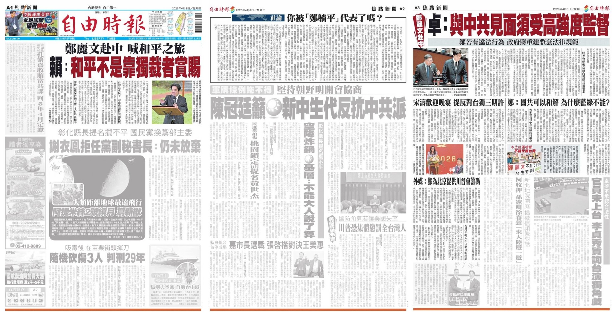 鄭麗文配合中國赴中統戰,自甘中國伸手台灣的傀儡。自由時報並沒太多著墨,而是強調政府捍衛主權的立場,社論質疑其代表性。